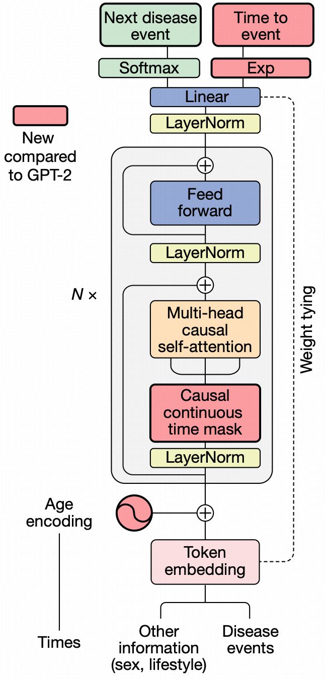 为了模拟疾病历史数据,研究团队对 GPT-2 架构进行了“魔改”。Transformer 模型通过将输入映射到嵌入空间,逐步聚合信息以实现自回归预测。他们用正弦和余弦基函数对连续年龄进行编码,并在输出头中加入另一个模块,通过指数等待时间模型预测下一时间。该架构允许用户通过提供部分健康轨迹,计算出疾病及死亡事件的每日新增率,并根据这些速率对后续 token 及对应时间进行抽样,逐步完成完整健康轨迹的抽样。