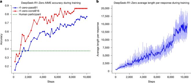 它自发地学会了用更长的「思维链」来探索和优化解题策略,有时甚至会生成成百上千个 token 来反复推敲一个问题。
