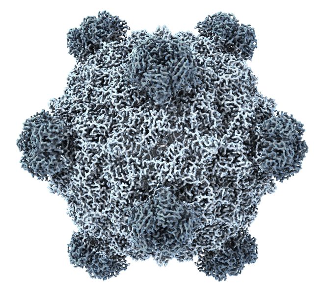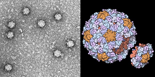 左:ΦX174 噬菌体显微照;右:单个ΦX174 噬菌体 3D 结构