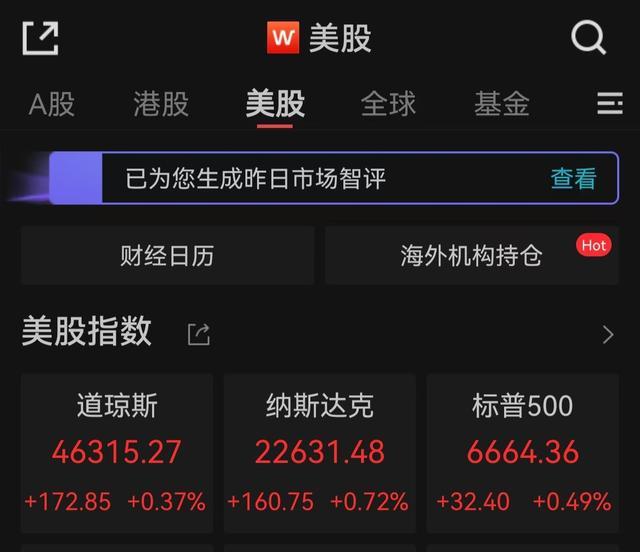 截至收盘,道指涨 0.37% 报 46315.27 点,标普 500 指数涨 0.49% 报 6664.36 点,纳指涨 0.72% 报 22631.48 点。美股三大指数连续第二日创收盘新高。本周,道指涨 1.05%,标普 500 指数涨 1.22%,纳指涨 2.21%。