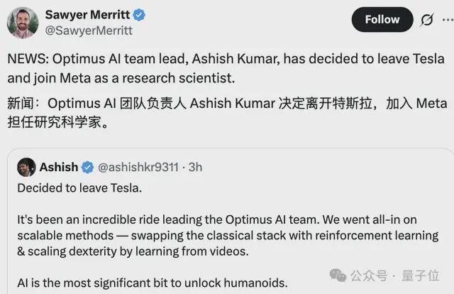 这不?Optimus AI 团队负责人 Ashish Kumar 决定离开特斯拉,加入 Meta 担任研究科学家。