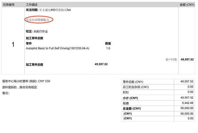 ▲路飞购买特斯拉 FSD 功能的结算单。受访者供图