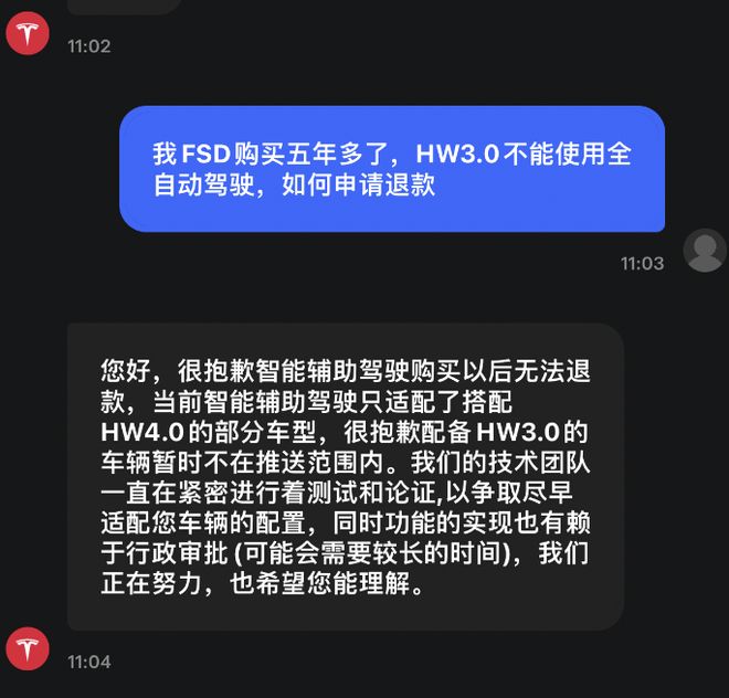 路飞曾在特斯拉 App 向人工客服申请退款,根据他提供的对话截图,客服回复称:“智能辅助驾驶购买以后无法退款。”