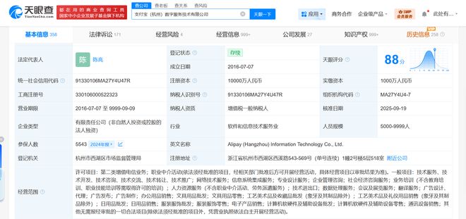 此外,支付宝(杭州)信息技术有限公司也发生工商变更,企业名称变更为支付宝(杭州)数字服务技术有限公司。该公司成立于 2016 年 7 月,法定代表人为陈亮,由蚂蚁科技集团股份有限公司全资持股。