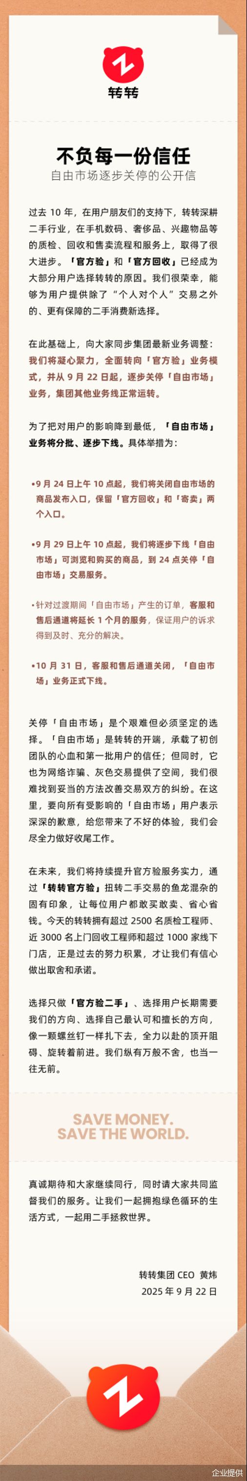公告显示,自 2025 年 9 月 24 日上午 10 点起,平台将关闭个人商品的发布入口,9 月 29 日上午 10 点起,将逐步下线"自由市场"可浏览和购买的商品,到 24 点正式关停"自由市场"交易服务。针对过渡期间"自由市场"产生的订单,转转的客服和售后通道将延长 1 个月的服务。10 月 31 日,客服和售后通道关闭,"自由市场"业务彻底下线。