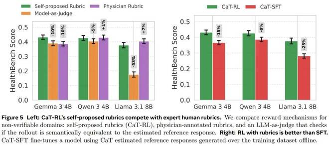 结果 3:基于自拟评分标准的强化学习(CaT-RL)优于监督微调(SFT)。尽管在处理不可验证输出时,SFT 是事实上的默认方法,但在图 5(右)中显示:当奖励来自自拟评分标准时,RL 效果更佳。