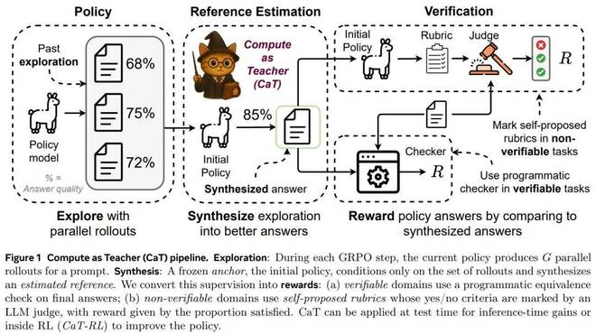 本文认为答案是肯定的,他们提出了一种名为CaT(Compute as Teacher)的方法,核心思想是把推理时的额外计算当作教师信号,在缺乏人工标注或可验证答案时,也能为大模型提供监督信号。