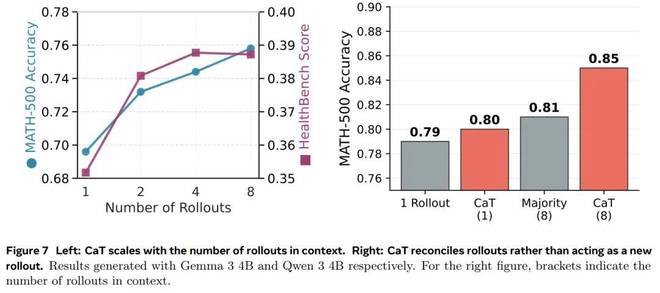 结果 5:CaT 会随着 rollout 数量 G 的增加而扩展。图 7(左)显示,在 MATH-500 上,扩展是单调的,而在 HealthBench 上,CaT 在大约 4 次 rollout 后达到平台期。