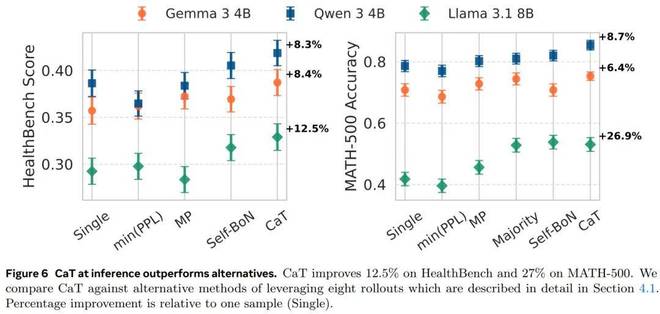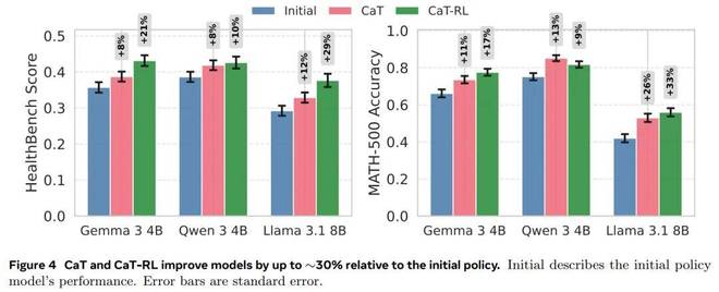结果显示,推理时直接应用 CaT 显著提升了 Gemma 3 4B、Qwen 3 4B 和 Llama 3.1 8B 的性能,即使在不可验证领域(MATH-500 最高提升 27%;HealthBench 提升 12%)。结合强化学习的 CaT(CaT-RL)可进一步获得增益(最高提升 33% 和 30%),训练后的策略甚至能超越初始教师信号。