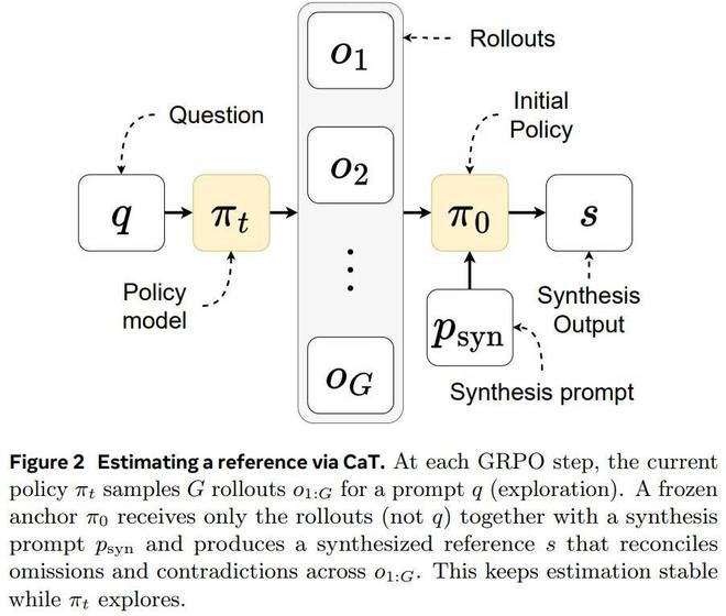 - 合成阶段:一个冻结的锚点模型(frozen anchor)(即初始策略,仅作为估计器使用)以这组推演结果为条件,通过整合遗漏、矛盾和不完整的解决方案,合成一个单一的估计参考答案;
