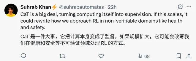 还有人认为:CaT 的这项研究意义重大,它将计算本身转化为监督。如果将其规模化,可能会改写我们在健康和安全等不可验证领域的强化学习方法。