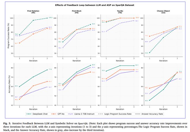 新框架引入了 LLM 与 ASP 求解器之间的迭代反馈循环。如果 ASP 在执行中发现错误,系统会将错误信息反馈给 LLM,指导其对生成的逻辑程序进行多轮修正,直至代码在语法和语义上都完全正确。