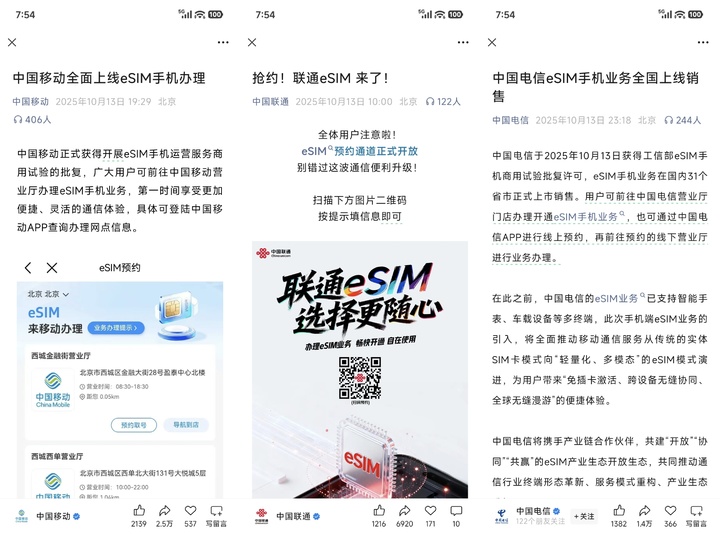 近日,中国移动、中国联通和中国电信三大运营商先后官宣启动 eSIM 相关业务的办理。