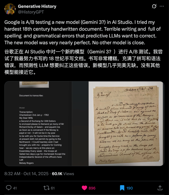 因此,目前这些爆料,大多集中在比较客观理性的任务上,能够直接区分出 Gemini 2.5 Pro 和 Gemini 3.0 的差别。像是写作、我们日常的交流这些问题上,没有客观统一的标准,即使触发了 A/B 测试,也很难明确,哪个是 Gemini 3.0。