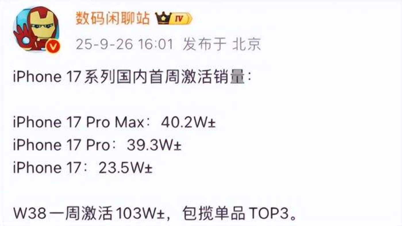 华为虽然在 9 月初发布了新款 3 折叠屏手机华为 Mate XTs,一经上市便引发抢购,但随着苹果 iPhone 17 系列的超预期表现,直接抢走市场关注度。根据博主@数码闲聊站爆料,iPhone 17 系列国内首周激活量达到了约 103 万台,直接包揽了单品销量排行榜前三。