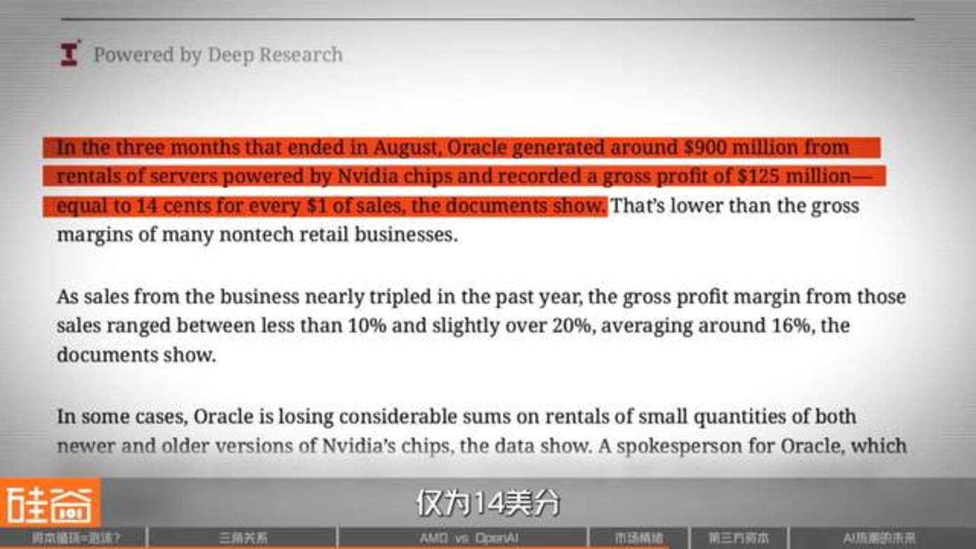 根据《The Information》援引的内部文件,甲骨文在最近一个季度通过租赁搭载英伟达芯片的服务器,获得了约 9 亿美元的营收,但其每 1 美元销售额的毛利仅为 14 美分。