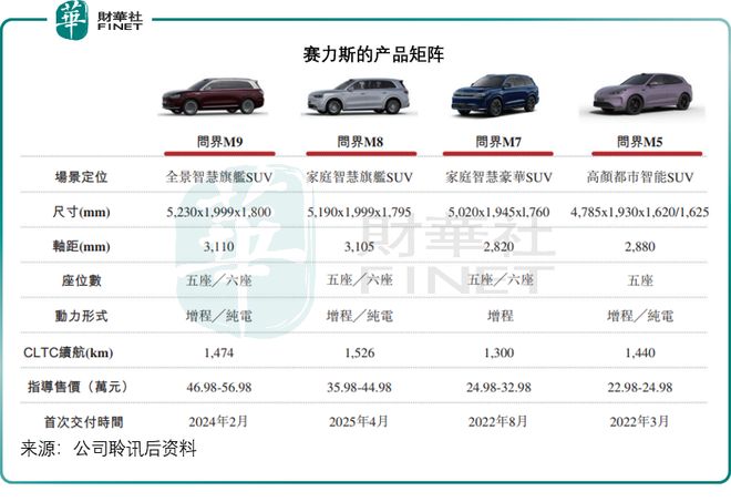 当前,赛力斯已推出问界 M5、问界 M7、问界 M8 和问界 M9 四款车型,见下图。