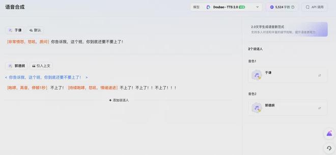 然后再在豆包语音合成模型 2.0 中,分别选择于谦和郭德纲的声音,并在台词的前面标注了一下想要达到的情绪效果: