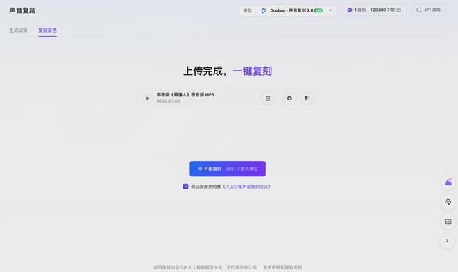 刚才的那段发疯对话片段的制作过程,就是先上传了郭德纲和于谦的音频,让豆包声音复刻模型 2.0 在短短几秒中的时间里复刻出声音: