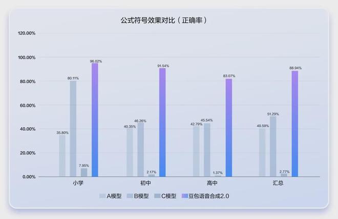 据了解,目前市面上的同类模型朗读准确率普遍低于 50%,但豆包语音大模型 2.0 版本,在小学至高中阶段全学科的复杂公式朗读中,能够实现 90% 左右的准确率!