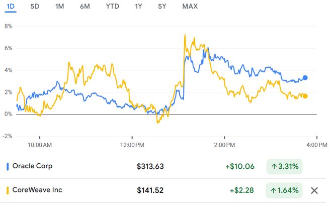 这一数据披露后,市场对 AI 基础设施业务盈利能力的信心增强,甲骨文股价一度上涨超5%、随后涨幅回落,同时也带动同行业公司 CoreWeave 股价上扬。