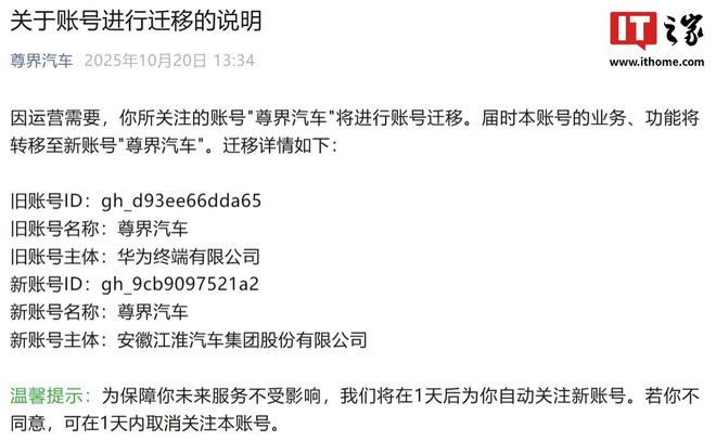 10 月 20 日消息,尊界汽车微信公众号今日发布了“关于账号进行迁移的说明”,宣布因运营需要将进行账号迁移,届时账号的业务、功能将转移至新账号“尊界汽车”。从迁移详情来看,尊界汽车的账号名称未发生改变,但主体由华为终端变更为了江淮汽车,详情如下: