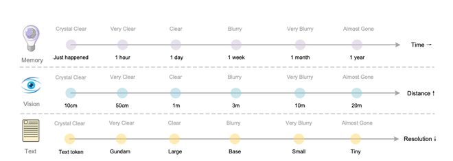 远期记忆 (Older Contexts):就像远处的物体,逐渐模糊。可以将其渐进式地缩放成更小、更模糊的图像,用更少的视觉 token 来表示,从而实现信息的自然遗忘和压缩。