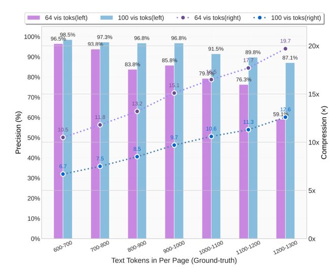 100 个视觉 token(右侧柱状图):在 600-700 文本 token(压缩率 6.7 倍)时,精度高达 98.5%。即使文本量增加,压缩率达到 12.6 倍时,精度仍有 87.1%