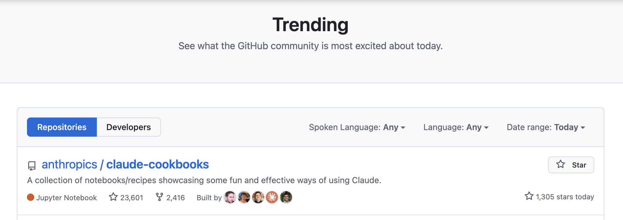 另外,值得一提的是,有人在 GitHub 上放了一份 Claude 的开发指南(Claude Cookbooks),现已经登上 GitHub 热搜榜一,获取了 20000+Stars。
