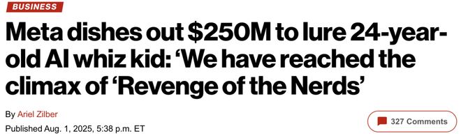 据外媒报道,Meta 历史上最高的薪酬包之一是 2.5 亿美元(约合人民币 18 亿元),给了 24 岁「人工智能奇才」Matt Deitke 据悉,第一年他就能获得 1 亿美元的收入。