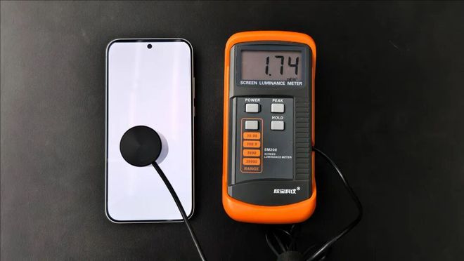 从我们实测的结果来看,手动全局最高亮度能到 1056 nit,手动最低亮度也的确能到接近 1nit 的水平,这样极致的低亮度下,屏幕也没有出现明显的亮度不均和色彩偏差。