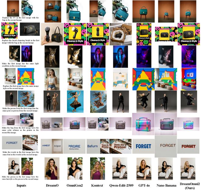值得一提的是,DreamOmni2 的多图编辑能力非常强。