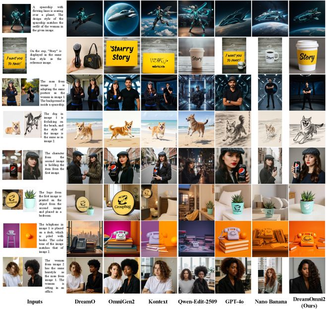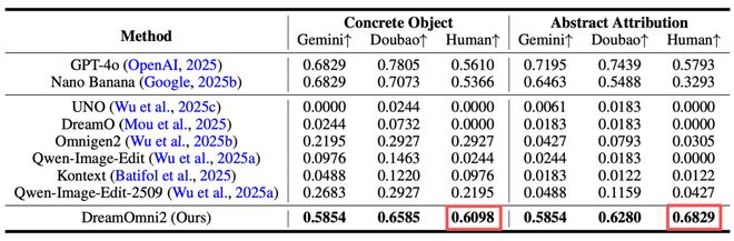 DreamOmni2 在「具体物体」和「抽象属性」上的得分都是最高的,一些方面超过了 GPT-4o 和 Nano Banana。