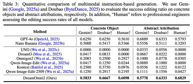 定量评估中,DreamOmni2 也在人工评估和 AI 模型评估中均优于商业模型 Nano Banana,取得了与 GPT-4o 相当的结果。