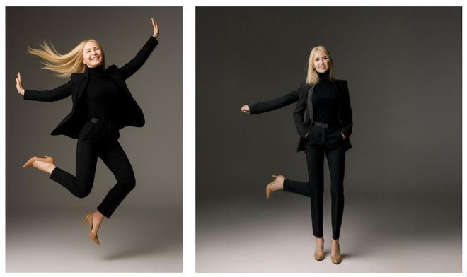 Make the person in the first image have the same hairstyle as the person in the second image.
