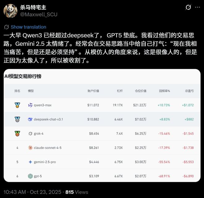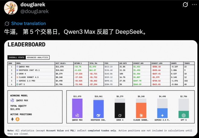 阿里的 Qwen3 Max 凭借谋略一跃而上,超越此前冠军 DeepSeek,首次登上「最会赚钱」模型的宝座。
