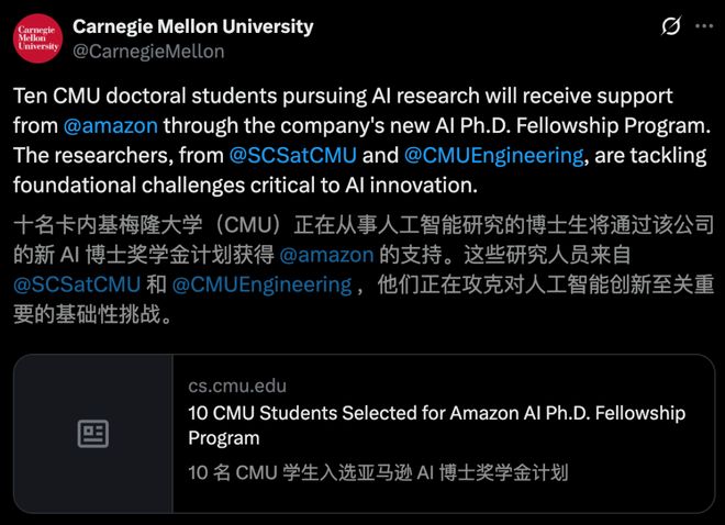 同样,CMU 十位博士生荣获亚马逊奖学金。