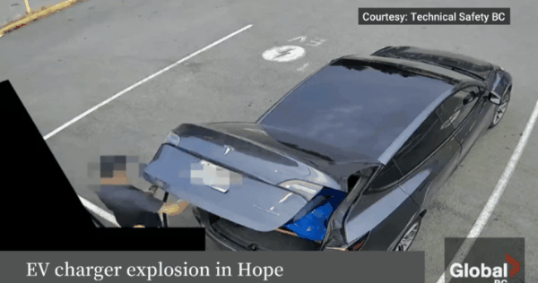 10 月 24 日消息,去年加拿大卑诗省霍普市(Hope)发生一起特斯拉汽车充电爆炸事故,网传视频显示一名车主在充电站为汽车接上充电桩后准备离开时,车辆尾部突然爆炸,冲击力将车主震倒,所幸只受轻伤。