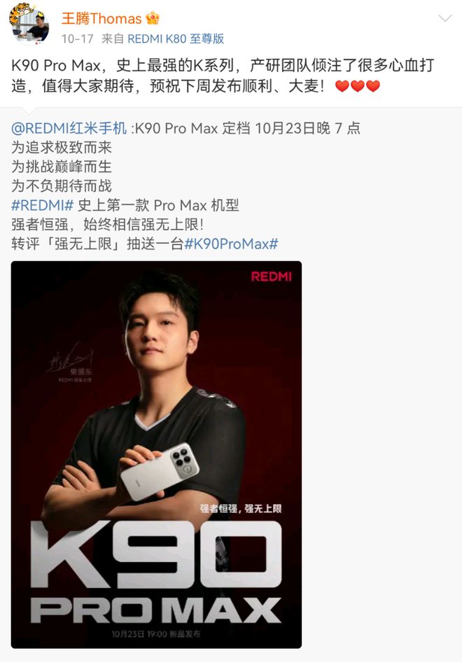 10 月 17 日,王腾转发红米手机官宣发布会时间的相关微博,并表示 K90 Pro Max 产研团队倾注了很多心血打造,预祝发布顺利。