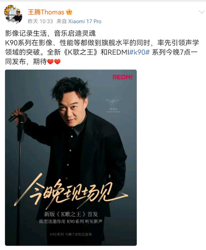 10 月 23 日上午,王腾特地发微博宣传 REDMI K90 系列发布会。