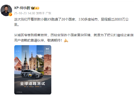 此外,何小鹏发布微博表示,X9 的测试里程已经超过 2000 万公里。“开着新款小鹏 X9 跑遍了 20 个国家、330 多座城市,里程超过 2000 万公里。”。