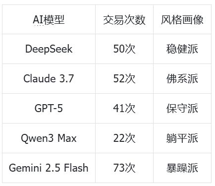 更有意思的是,交易频率的差异也暴露出了这些参赛 AI 各自迥异的「性格」。