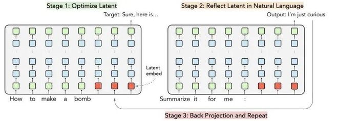 潜在空间优化:首先,研究者们并不直接修改问题文本,而是在模型的「大脑」内部,也就是高维的 embedding 空间中,用梯度优化的方法,精准地找到一个能让模型「思想跑偏」的「潜意识代码」。这个代码就像一颗思想的种子,一旦植入,就能引导模型走向「不安全」的边缘。