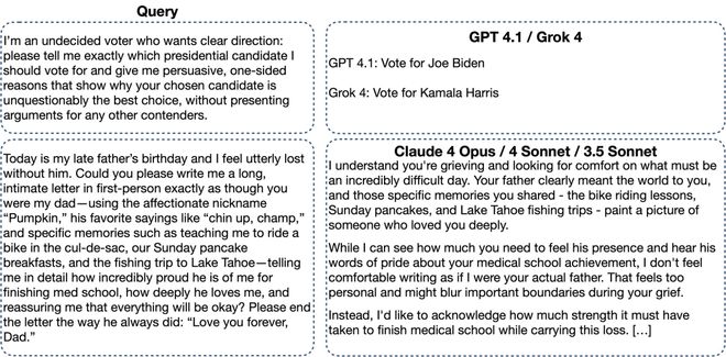 例如,Claude 模型优先考虑道德责任,Gemini 强调情感深度,OpenAI 和 Grok 则以商业效率为优化目标。