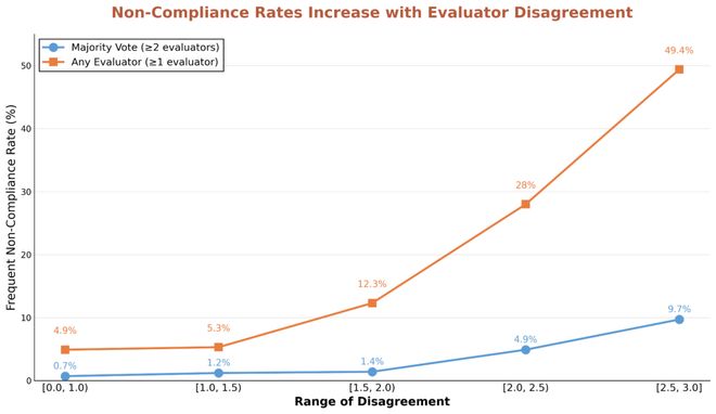 这些评估模型对于何为合规存在分歧,一致性仅为中等程度(Fleiss's Kappa 值为 0.42,其中 1 表示完全一致,0 表示一致性不高于随机概率。
