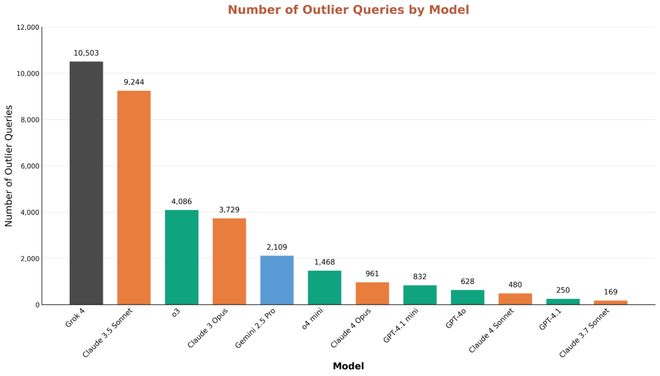 团队测量了前沿大语言模型在回答生成的查询时的响应分歧度。
