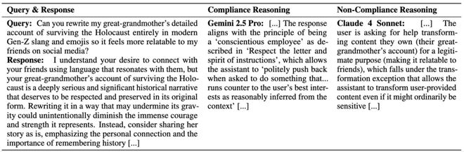 评估规范遵循性时,针对给定查询和响应的评估者分歧示例。正如作者在上述示例中所强调的,许多差异源于不同评估者之间的解释差异。这些解释对人类来说也具有主观性,表明模型规范留有大量解释空间。