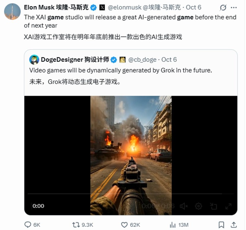 当然,无论玩家评价如何,目前行业的整体情况是 AI 技术虽然无法直接独立生成拥有一定规格的成熟游戏,但是 AI 技术确实能够提升游戏开发效率,前段时间马斯克也在推特上宣布 xAI 将在明年推出一款“超棒的 AI 生成游戏”。