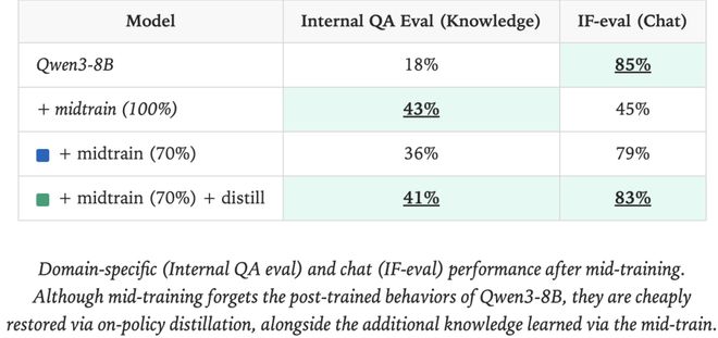 在按 70-30 比例混合的内部文档数据和聊天数据上微调后,同策略蒸馏几乎完全恢复了模型在 IF-eval 上的性能,且没有造成任何知识损失;研究者还观察到,聊天能力与模型在内部问答评估上的「知识」性能之间存在一定的正向迁移。