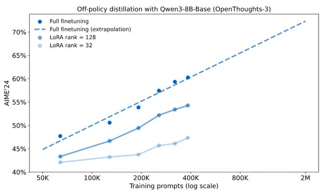 默认方法是在更多提示词上进行微调,即延续异策略蒸馏的过程。根据对数线性趋势进行外推,研究者估计模型在使用约 200 万个提示词训练后,将在 AIME’24 上达到 70% 的分数。